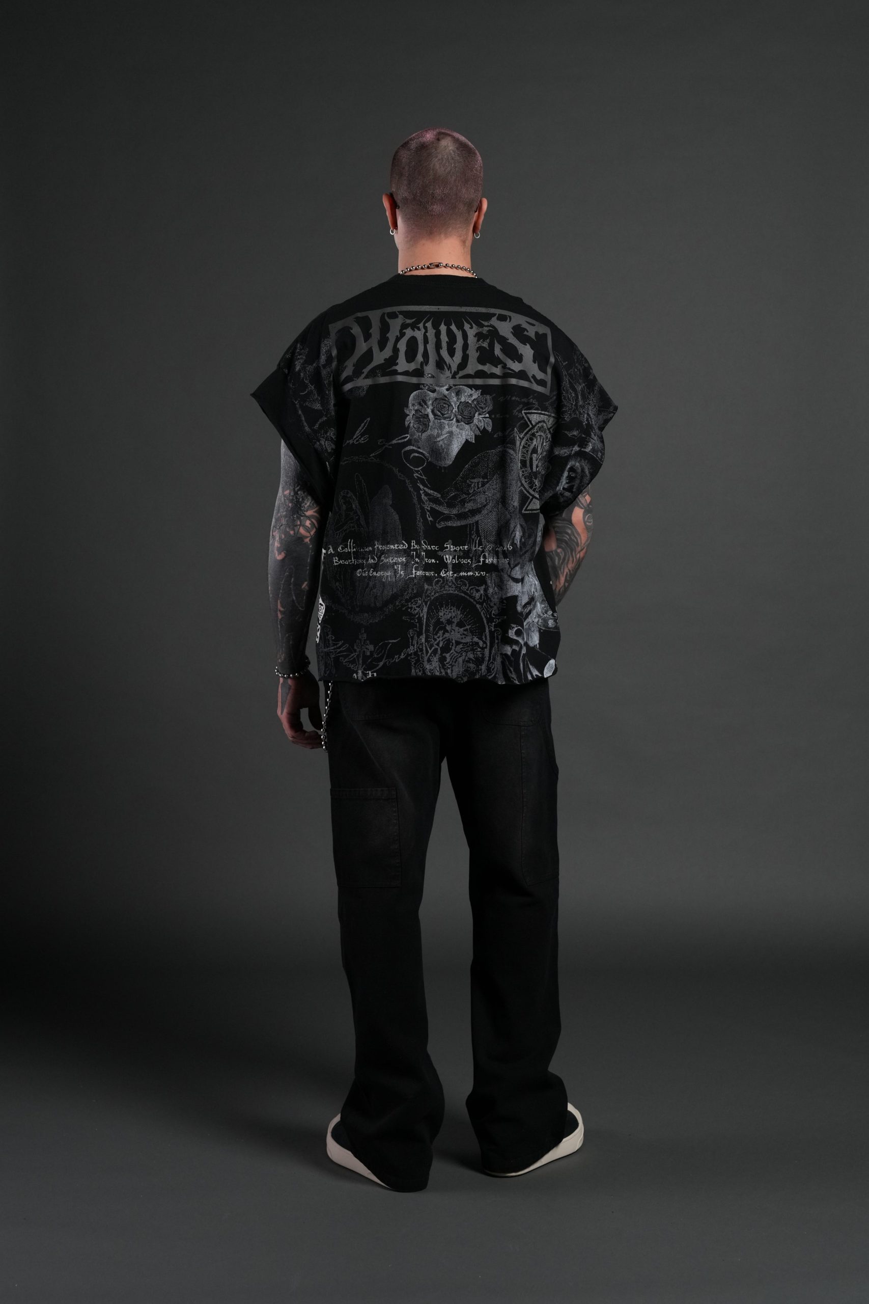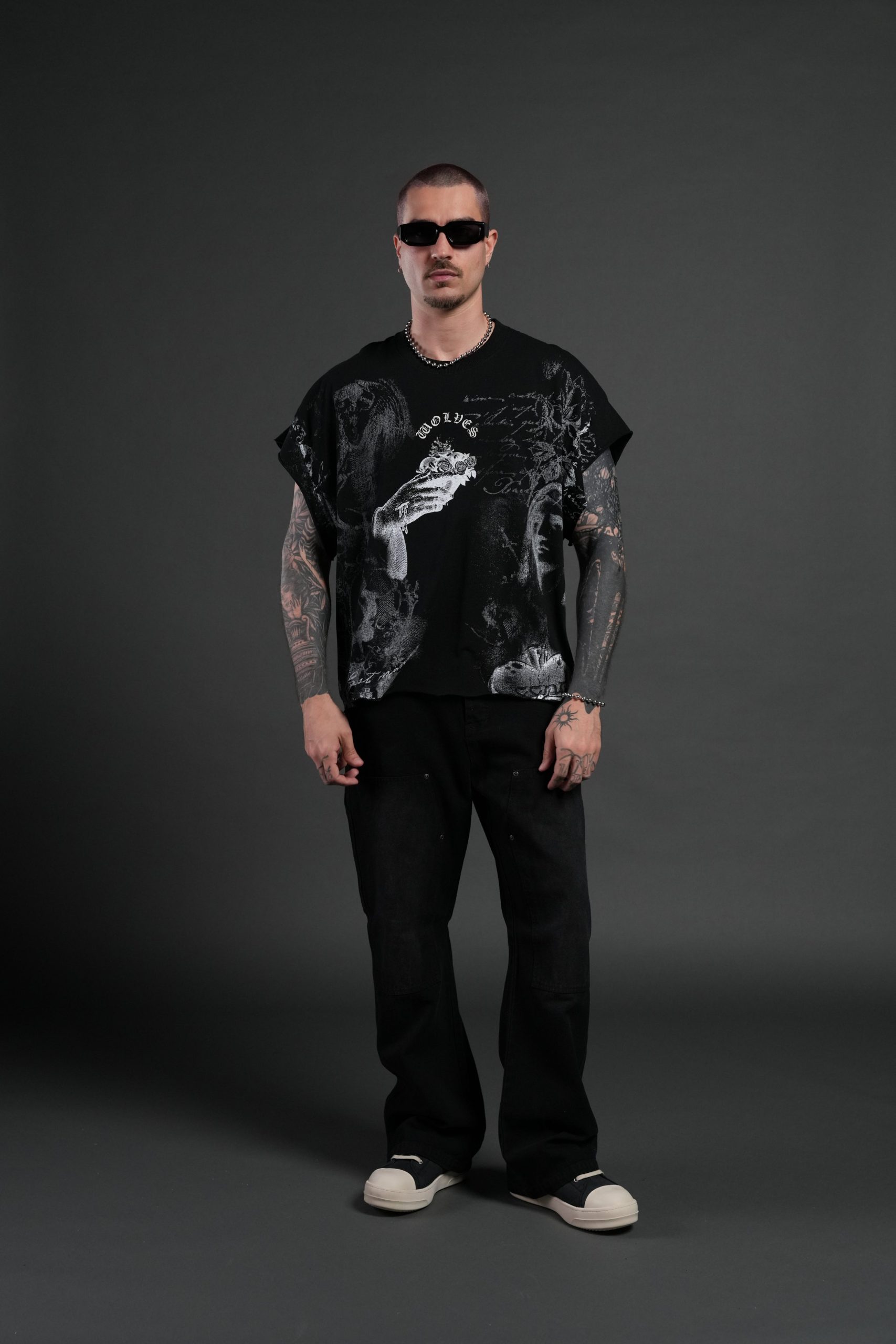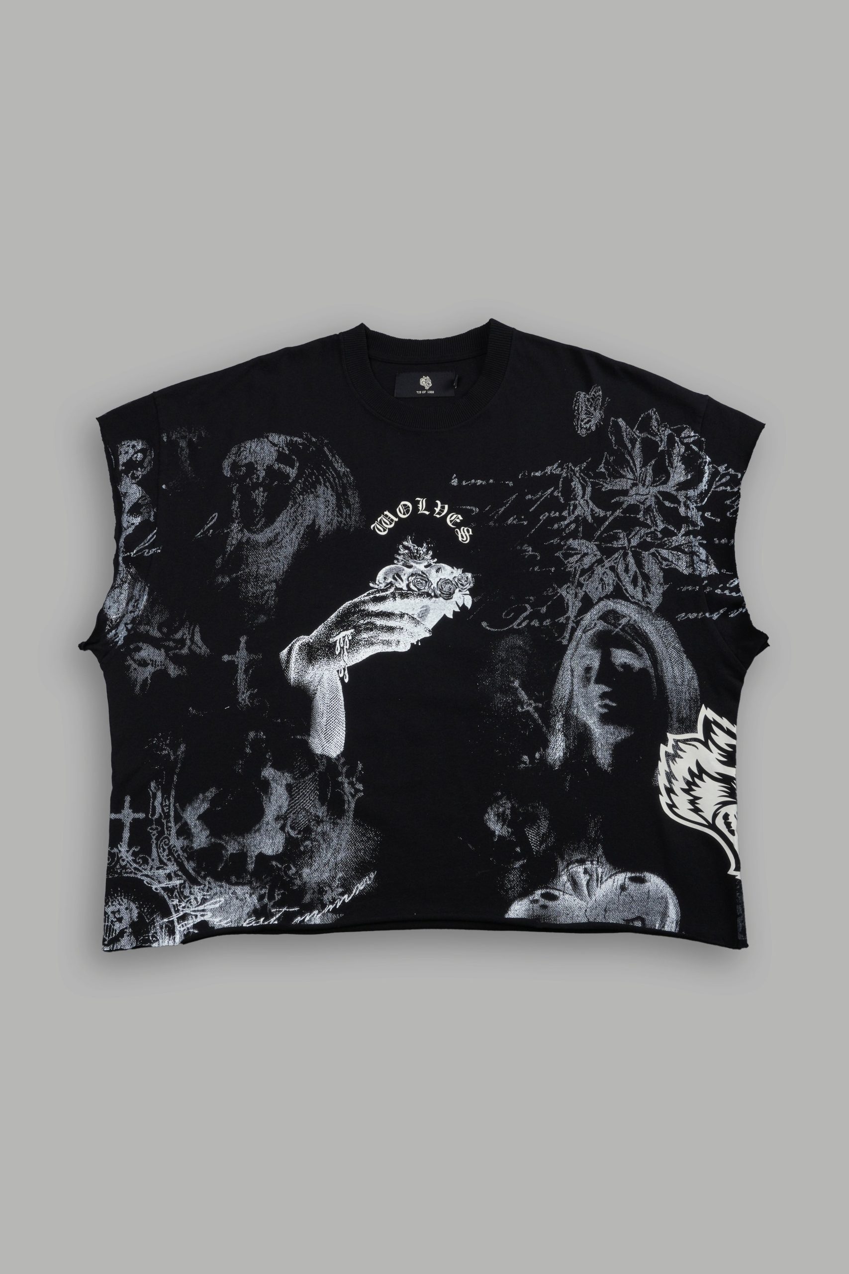 Heart of Thorns Distressed Grunge Cut-Off Mid-Length Raw Hem Tee in Black
