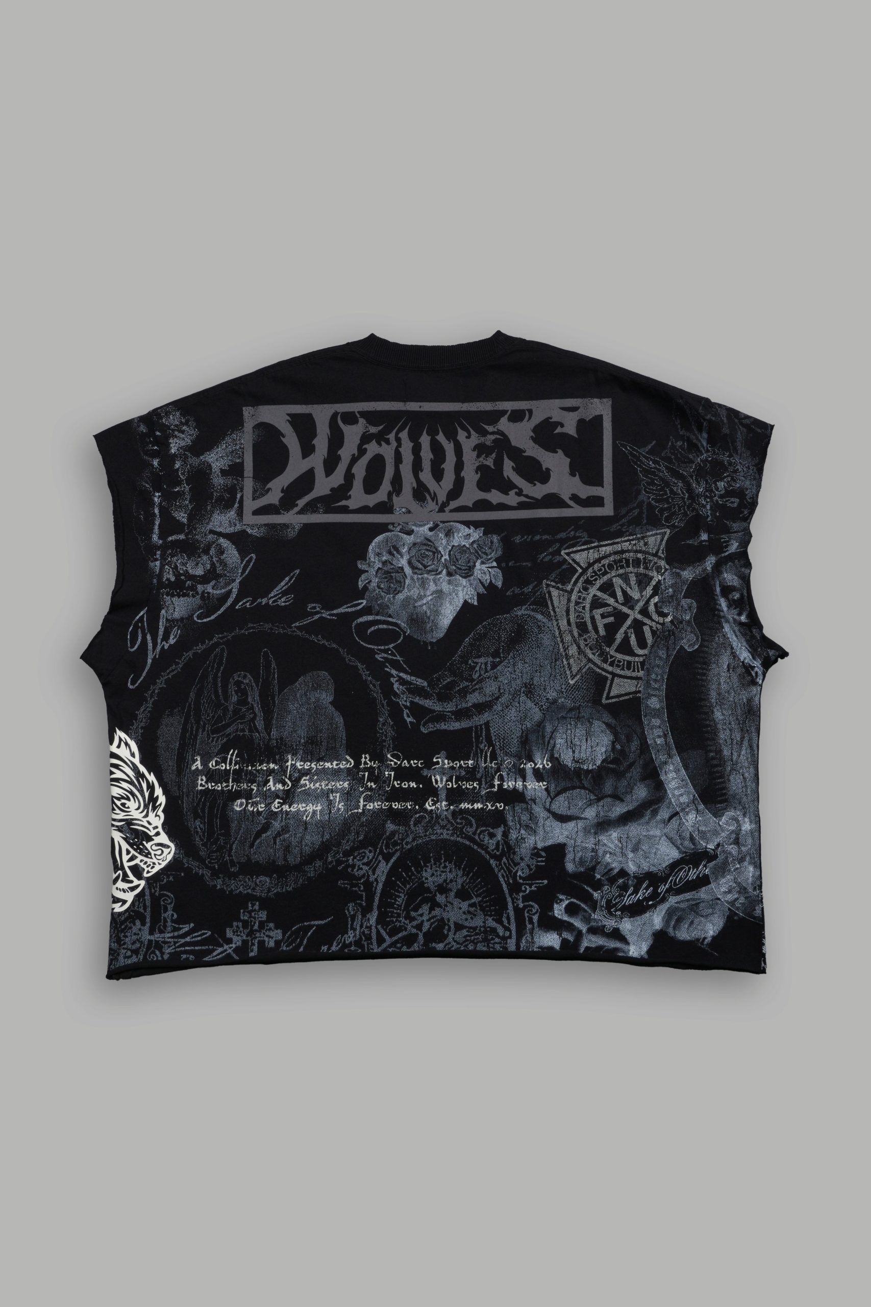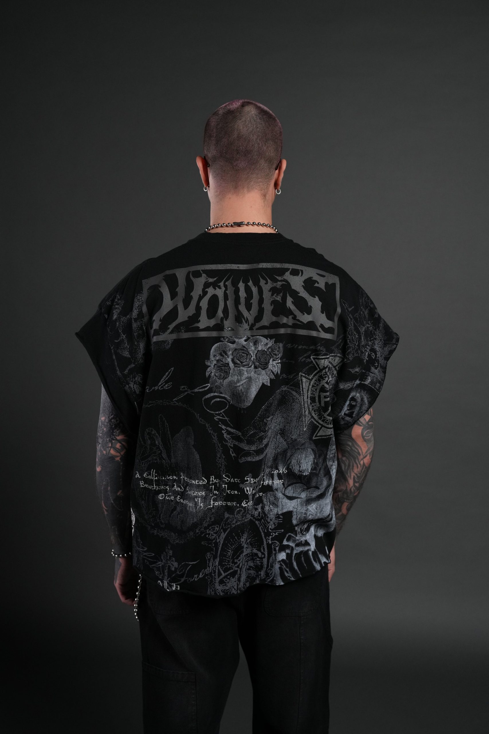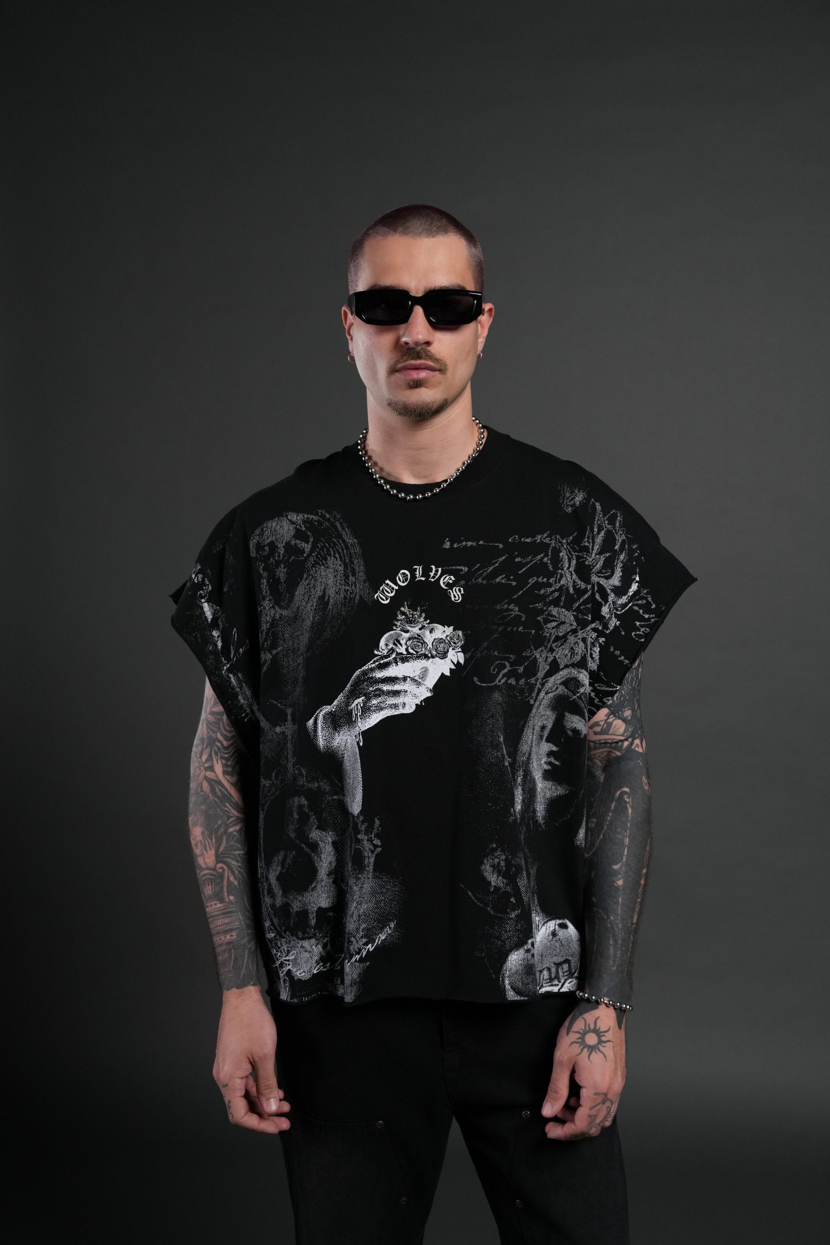 Heart of Thorns Distressed Grunge Cut-Off Mid-Length Raw Hem Tee in Black