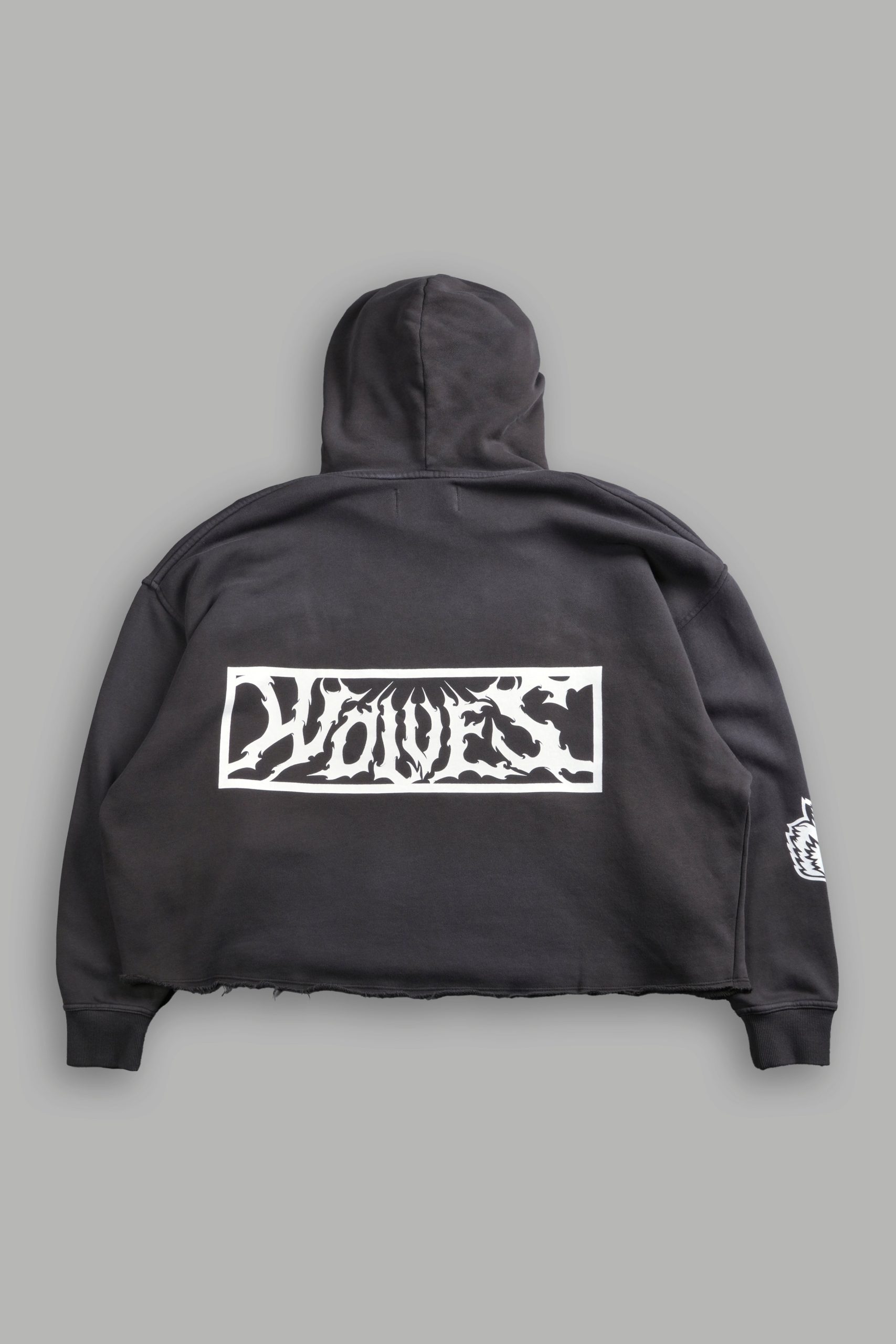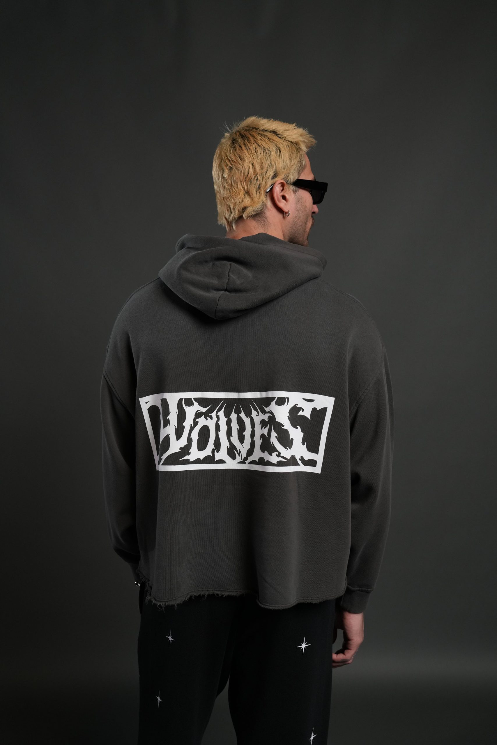 Midnight Wolves Raw Hem Box Cut Pierce Hoodie in Wolf Gray Drift Wash