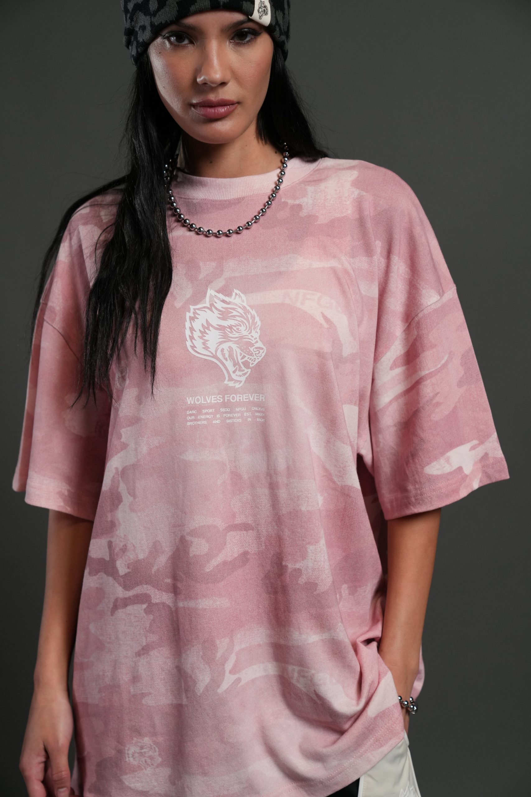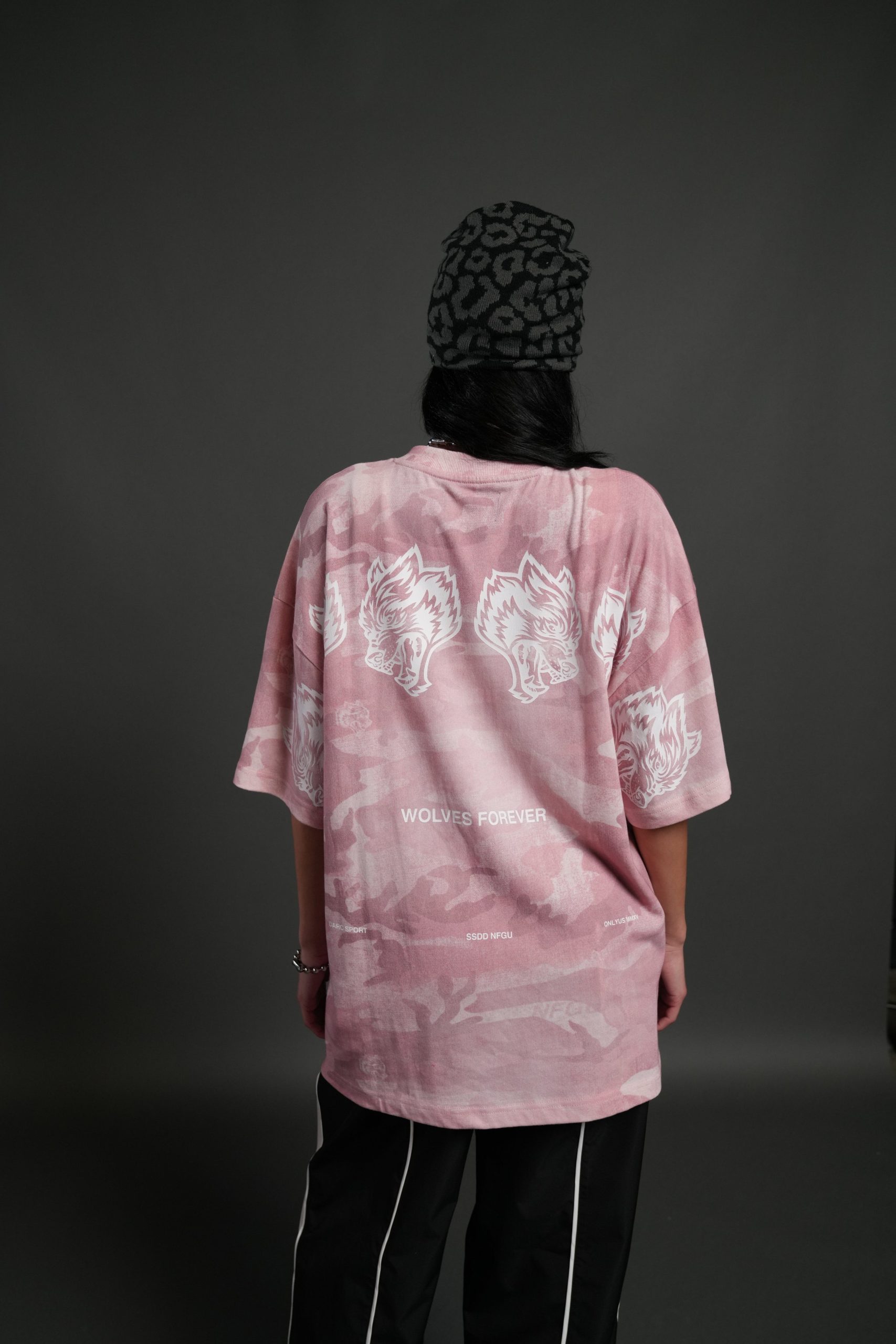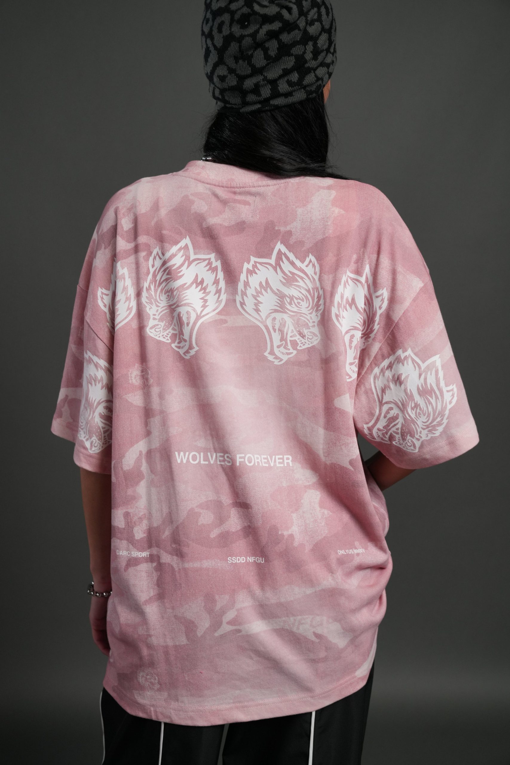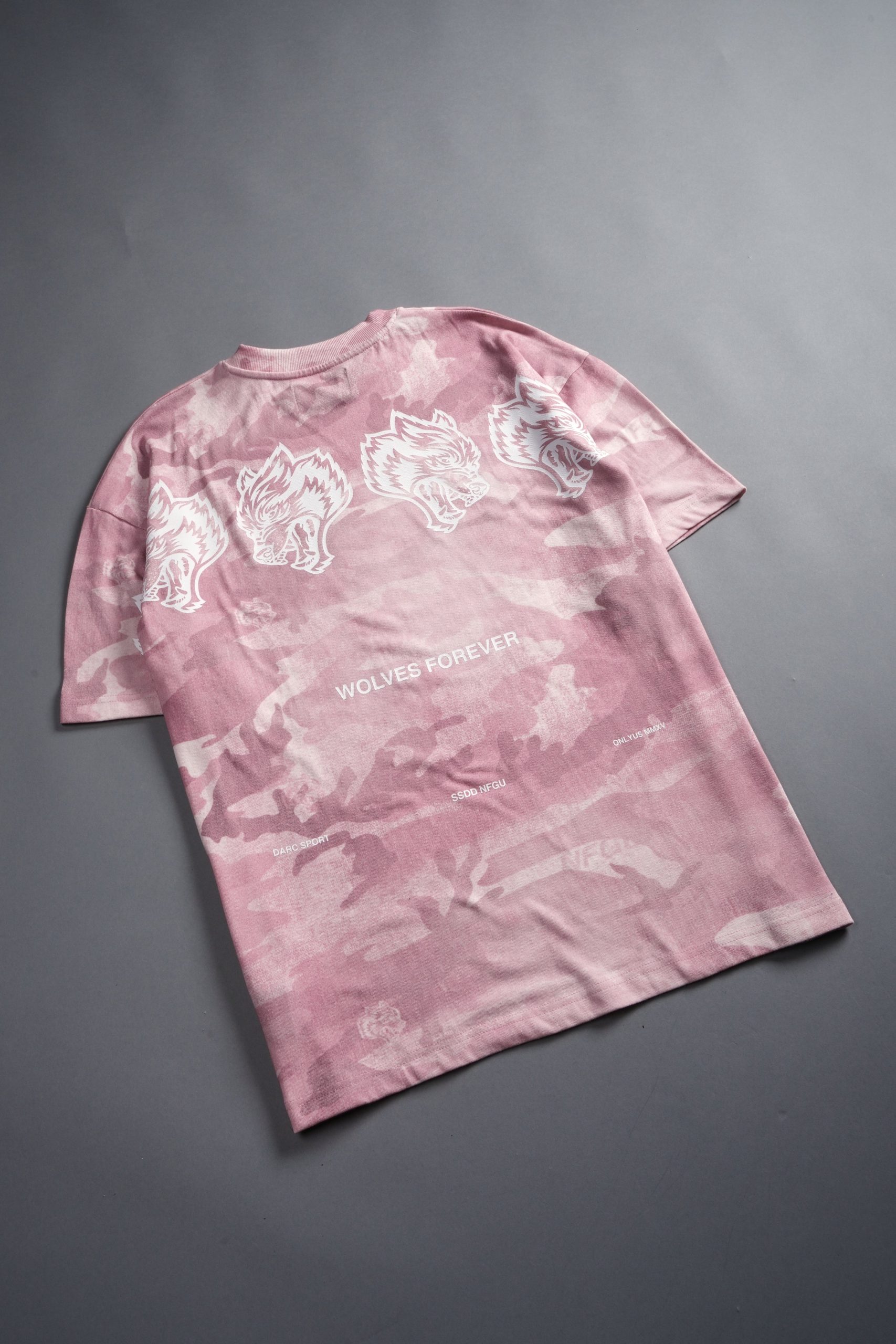 Wolves Have Your Back Unisex Premium Oversized Tee in Blush Vintage Woodland Camo